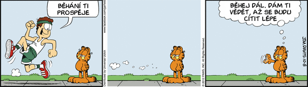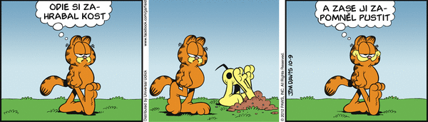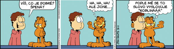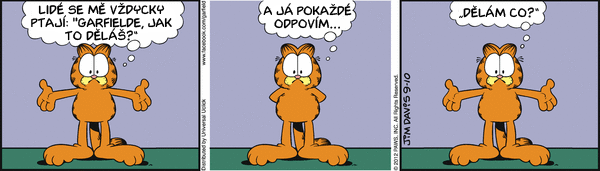 Dnes další měsíční série Garfielda: V tom, co je dobré, se jistě shodneme spíše s Garfieldem, než s Jonem, ale tušíte v čem tkví Odieho neúnavná spokojenost? Nebo co určitě v garfieldových stripech nenajdete? Jak může dopadnout takový šlofíček na rozkvetlé louce? Jaký je tajný kočičí pozdrav? Jaké to bude až budou světu vládnout myši? Kolik musí Garfield ochutnat sušenek než najde tu pravou? V čem příjde dnes Garfield k večeři?