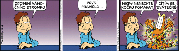 Přípravy na Vánoce vrcholí: Dávejte si pozor na kocoury se špatnou náladou! Při procházení rodinných alb se jistě dá užít spousta zábavy. Pomozte Jonovi vymyslet nějaké překvapení pro Lízu na večer. Nic vás nenapadlo ... no, ono to nakonec není třeba - večeře padla. Na blbé otázky, blbá ... Chcete vidět odieho ve svetru? Nebo Garfieldovy předvánoční halucinace? Dávejte si pozor na pusu před svými hladovými mazlíčky. Tak copak máme dnes v ledničce? Garfieldův nový koníček. Předpověď počasí. Je čas začít zdobit stromeček - jak to je říct? A když stromeček - tak pořádný.