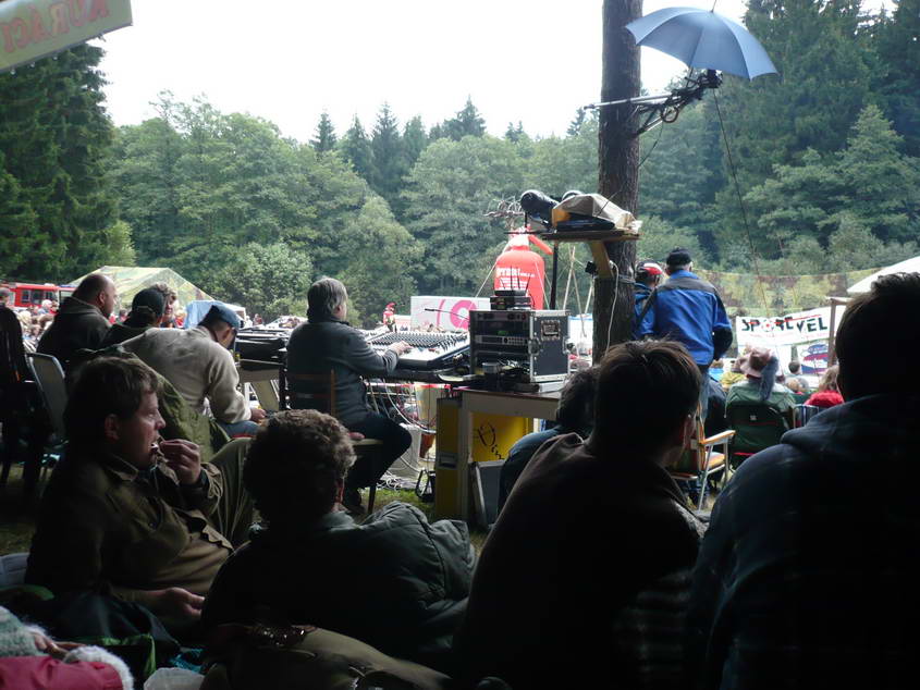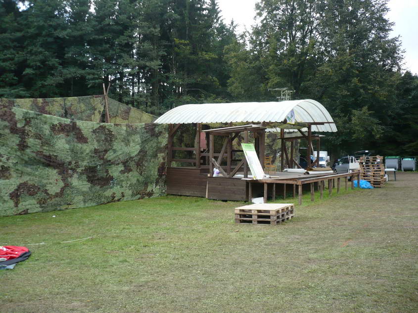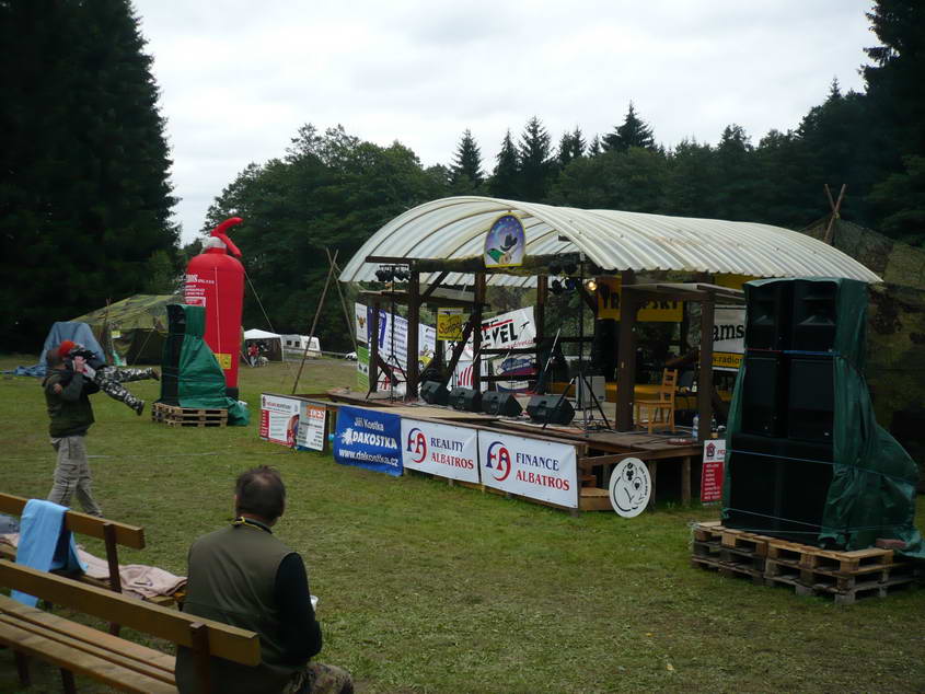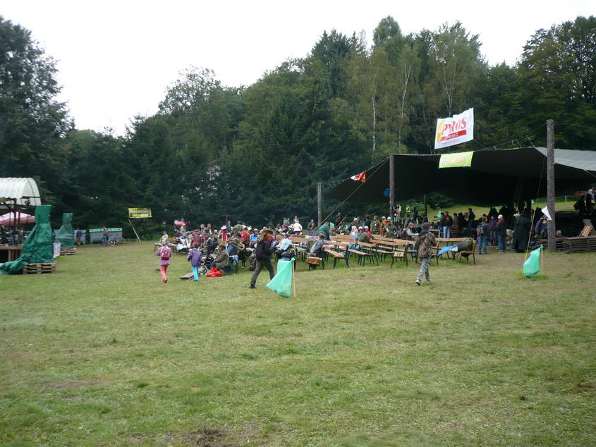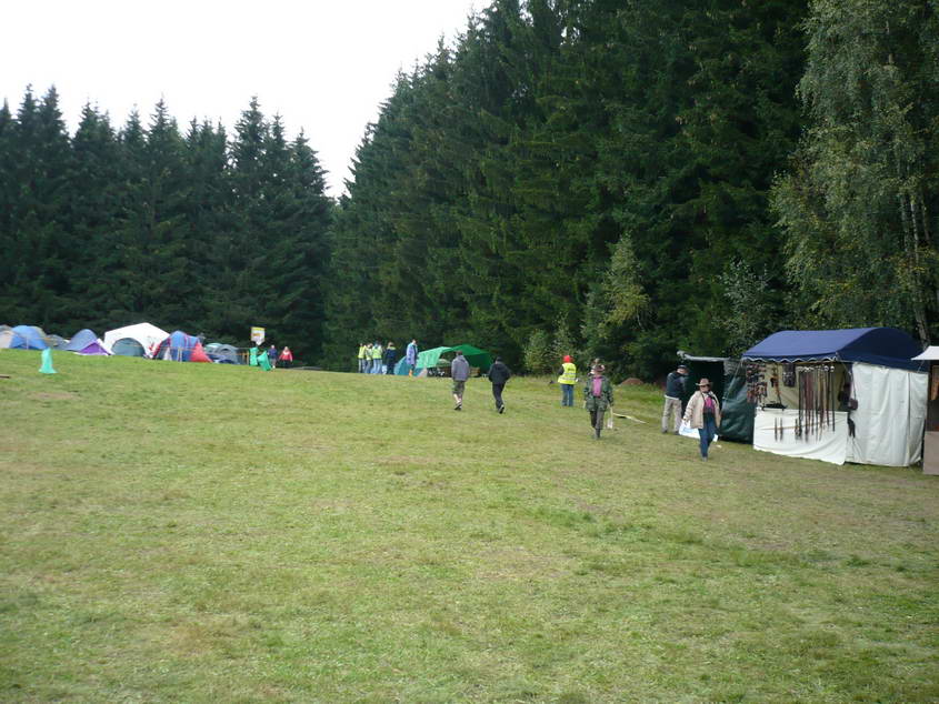 Na louce za hledištěm se stanovalo, vpravo začínají stánky a ToyToyky.