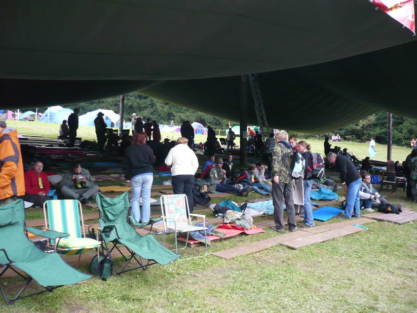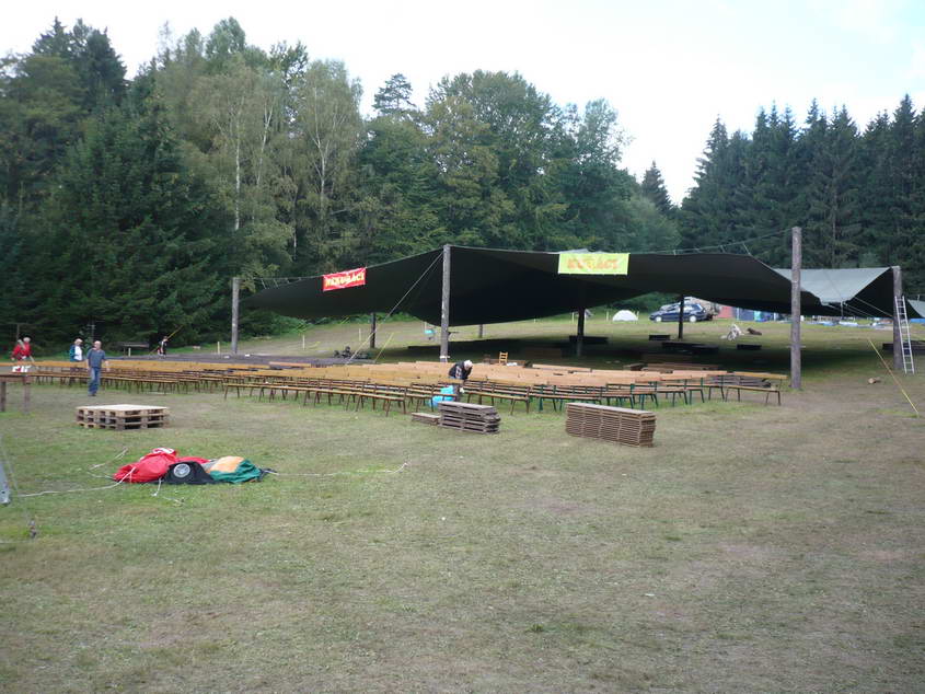 Zatímco loni jsme se pod plachtou schovávali před sluníčkem, letos posloužila jako obří deštník. Rychle zabrat výhodná místa - začíná se to tu plnit.