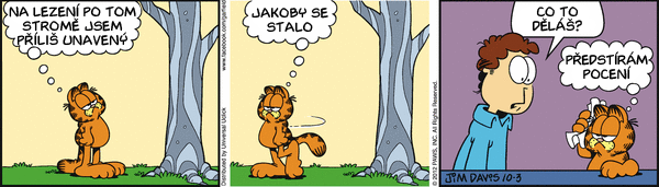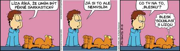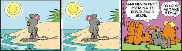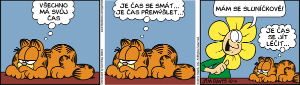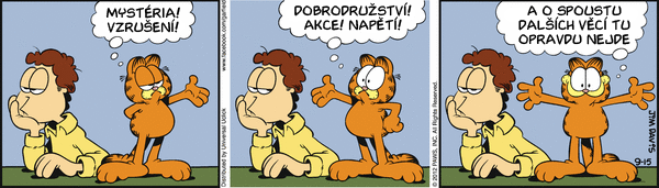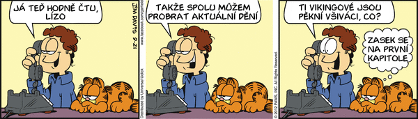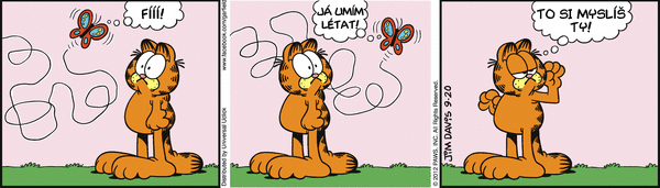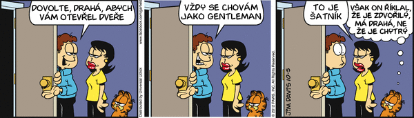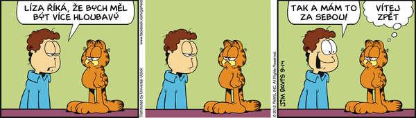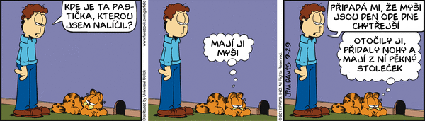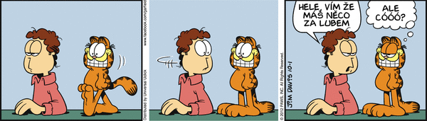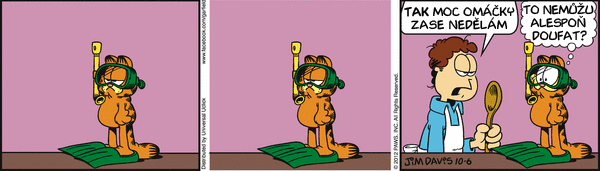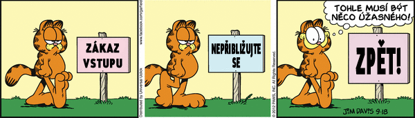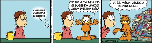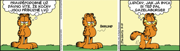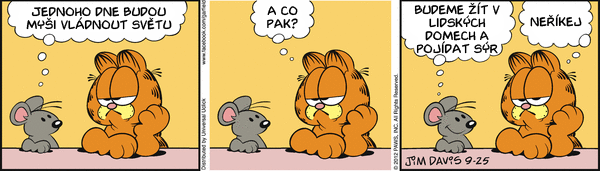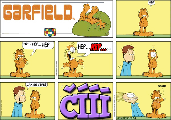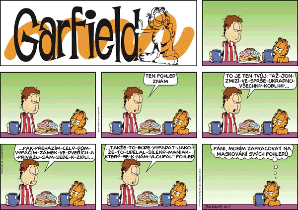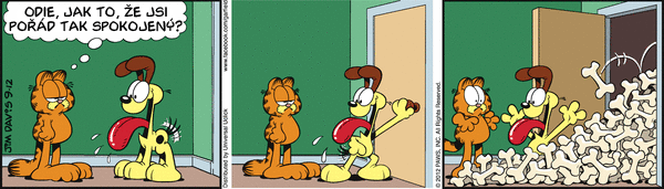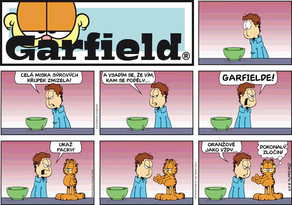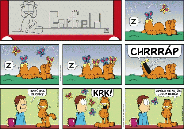 Dnes další měsíční série Garfielda: V tom, co je dobré, se jistě shodneme spíše s Garfieldem, než s Jonem, ale tušíte v čem tkví Odieho neúnavná spokojenost? Nebo co určitě v garfieldových stripech nenajdete? Jak může dopadnout takový šlofíček na rozkvetlé louce? Jaký je tajný kočičí pozdrav? Jaké to bude až budou světu vládnout myši? Kolik musí Garfield ochutnat sušenek než najde tu pravou? V čem příjde dnes Garfield k večeři?