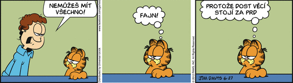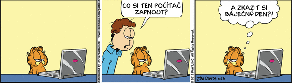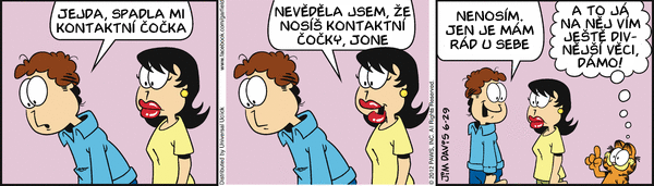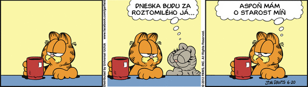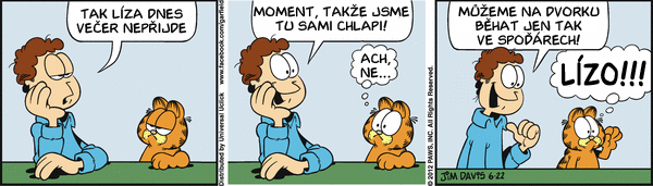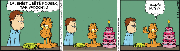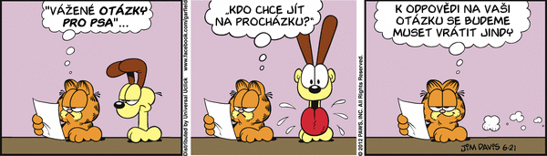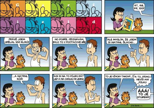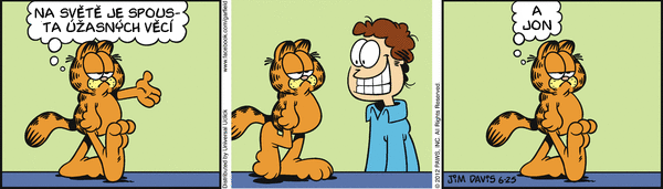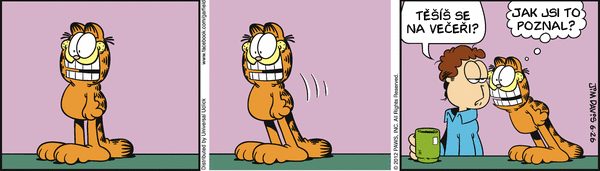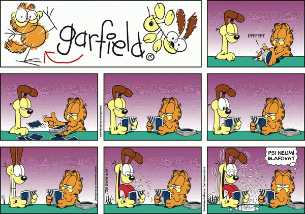 Garfiel má opět narozeniny. To nám ten rok zase utekl, což? Také byste chtěli narozeninový dort vaší velikosti? Po dlouhé době přijde na návštěvu Nermal. Podíváme se, jak probíhá natáčení pořadu "Otázky pro psa". Chlapi sami doma ... Pokrová partička s Odiem. Jak vypadá natěšený kocour? A uvidíme další Jonovy podivnosti. To vše v dnešním garfieldovském článku.