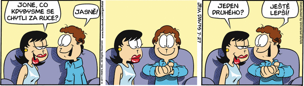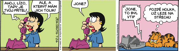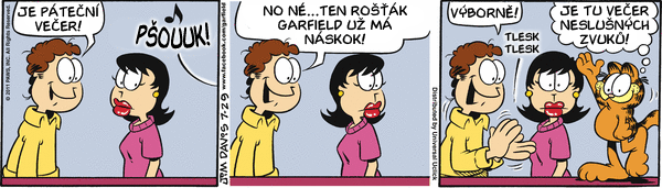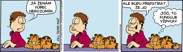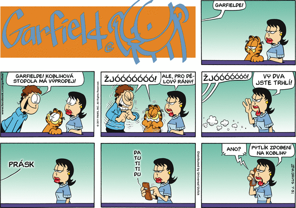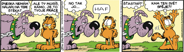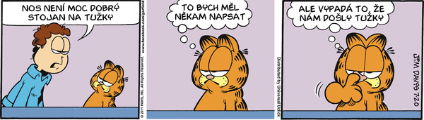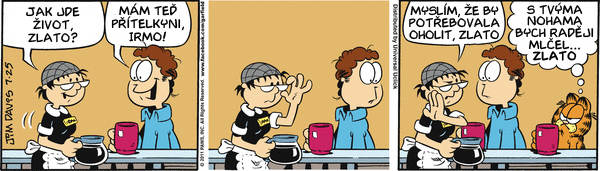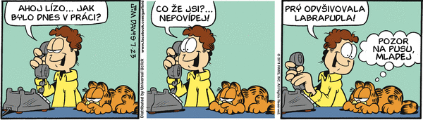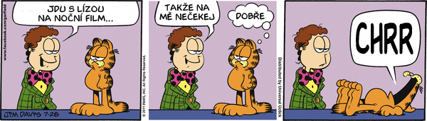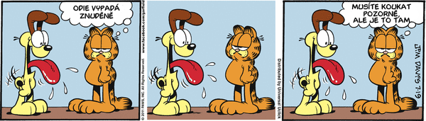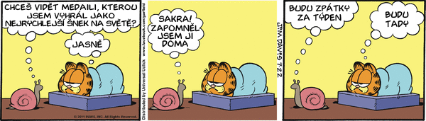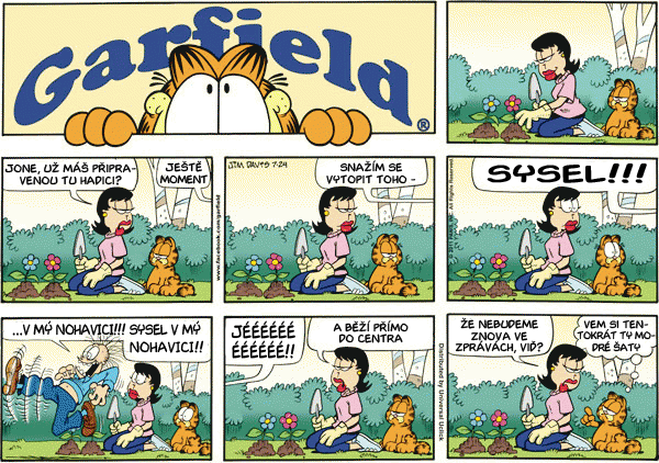 Garfieldova sebestřednost. Jak roznávat psí výrazy? Chcete vidět zlatou medaili nejrychlejšího šneka na světě? Tak to se načekáte ... Co se asi tak může přihodit při plení zahrádky ... Jon se svým kocourem už dlouho nezavítal na kafe k Irmě. Tentokrát to napraví. Jon romantik. Koblihová mánie. To vše a ještě mnohem víc jsou dnešní témata.