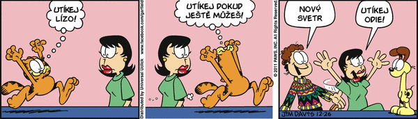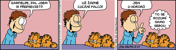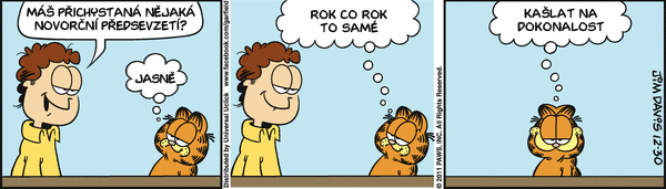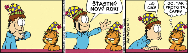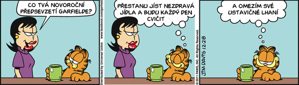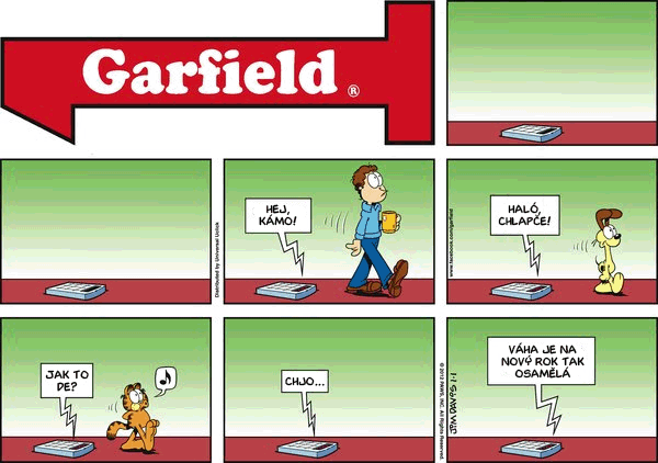 Pojďme s Garfieldem dorazit ten konec loňského roku. Co dát pod stromeček sněhulákovi? Jaké dárky jsou již za hranicí vkusu? Mají smysl novoroční předsevzetí? Kdo je na Nový rok sám?