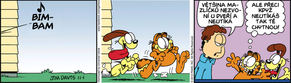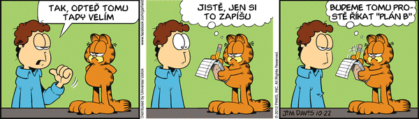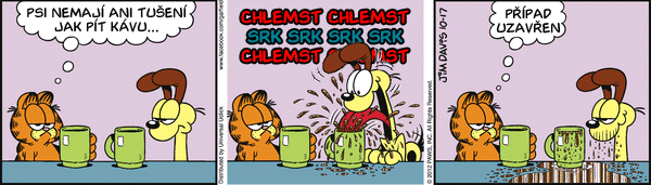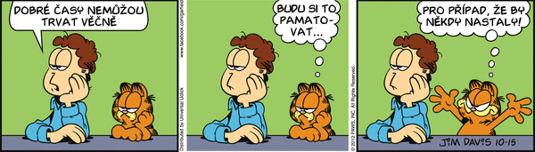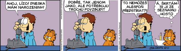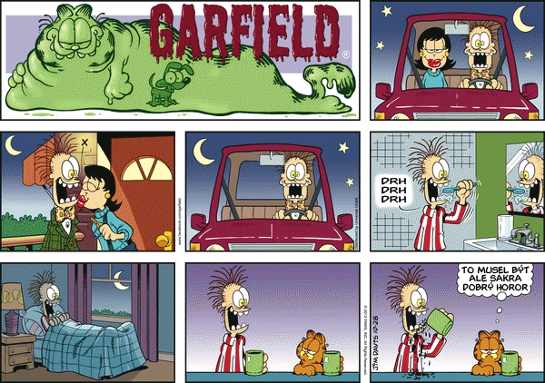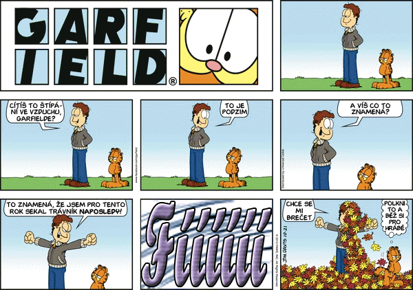 A máme tu podzim: Sportem ku zdraví. Jak může dopadnout taková falešná oslava narozenín? Jaké máte vzpomínky na školní kuchyň? Viděli jste někdy psa pít kávu? Taky se těšíte na podzim protože už nebudete muset sekat trávník? Jaký je Garfieldův názor na to, kdo je pánem domácnosti? Jak myslíte že dopadne Jonovo rande v autokině? Jon vzal Lízu na horor. Koukáte na televizi? Většina pořadů je myslím na úrovni "Divadla Prdící pytlík"...